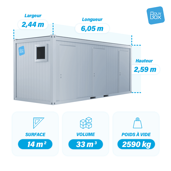 Ce modèle est conçu pour répondre à des besoins étendus en optimisant l’espace, et convient à des chantiers nécessitant des installations sanitaires. Notre module est utilisé par les entreprises du BTP, par les entreprises d’événementiel, mais aussi par les concessions automobiles.