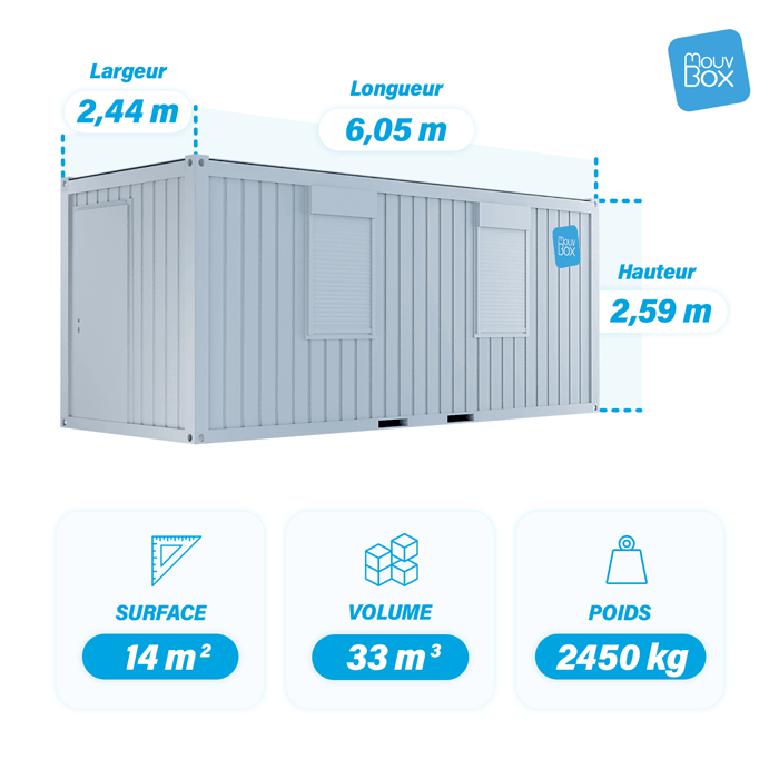 Le bureau modulaire 20 pieds permet d’installer des bureaux pour deux personnes. Il est principalement utilisé par les concessions automobiles, les administrations, sur les chantiers, comme loges lors d’événements ou pour des extensions de locaux. Ses dimensions classiques en font une solution facilement transportable et adaptée à différents environnements.