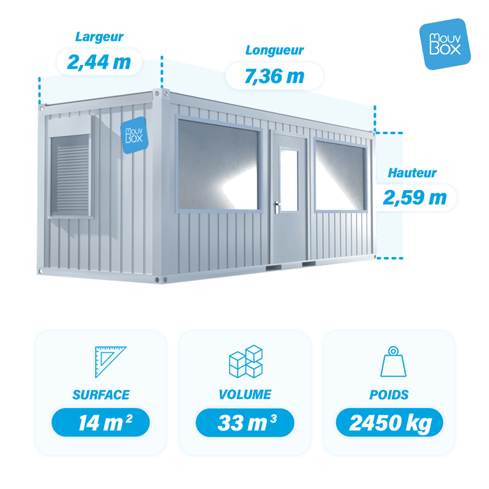 Ce bureau modulaire semi-vitré de 24 pieds comprend deux fenêtres de bureau oscillo-battante et un SAS. Il dispose d’équipements de chauffage, d’aération, de refroidissement et de volets roulants. Il garantit un environnement de travail agréable pour vos équipes. L’isolation des parois est assurée par de la laine de verre. Le bungalow dispose aussi d’équipements électriques standard qui répondent aux normes électriques FR.