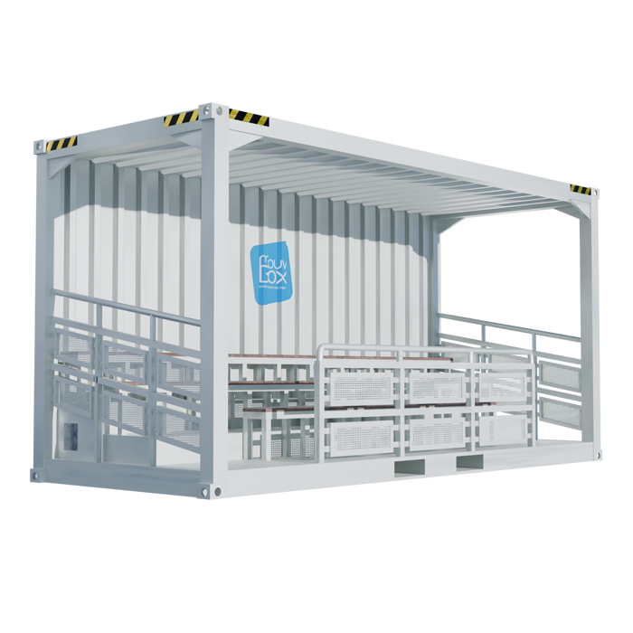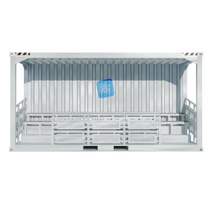 La Tribune Box est un gradin conçu à partir d’un container maritime 20 pieds High Cube, dont la hauteur a été augmentée de 30 cm. Elle propose 26 places assises sur bancs dans sa configuration standard, avec une option de sièges individuels conforme aux recommandations de la FFF et de la FFR.