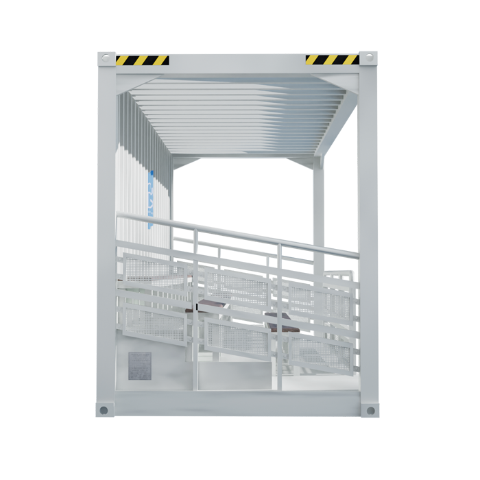 Gradin conteneur couvert en acier Corten, résistant aux intempéries et à l’usure, offrant un confort optimal quelles que soient les conditions climatiques.