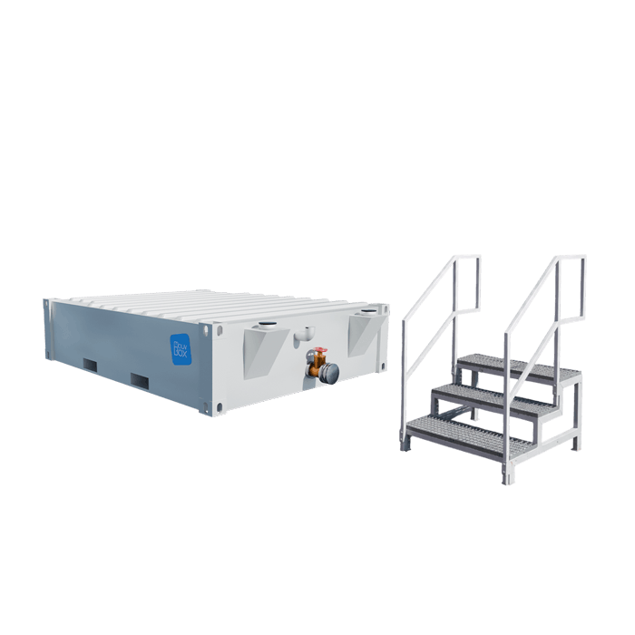Le réservoir d’eaux usées 10 pieds en location permet de collecter et de stocker temporairement les eaux usées. Il est doté d’un indicateur de niveau de remplissage, et assure une gestion efficace avec un volume de remplissage de 4m3, répondant aux besoins temporaires sur les chantiers ou lors d’événements. Le réservoir d’eaux usées est compatible avec nos modules sanitaires 10 pieds. Il est livré avec un escalier de 3 marches avec garde corps, facilitant l’accès. Il constitue une solution idéale pour les espaces restreints et les besoins temporaires.