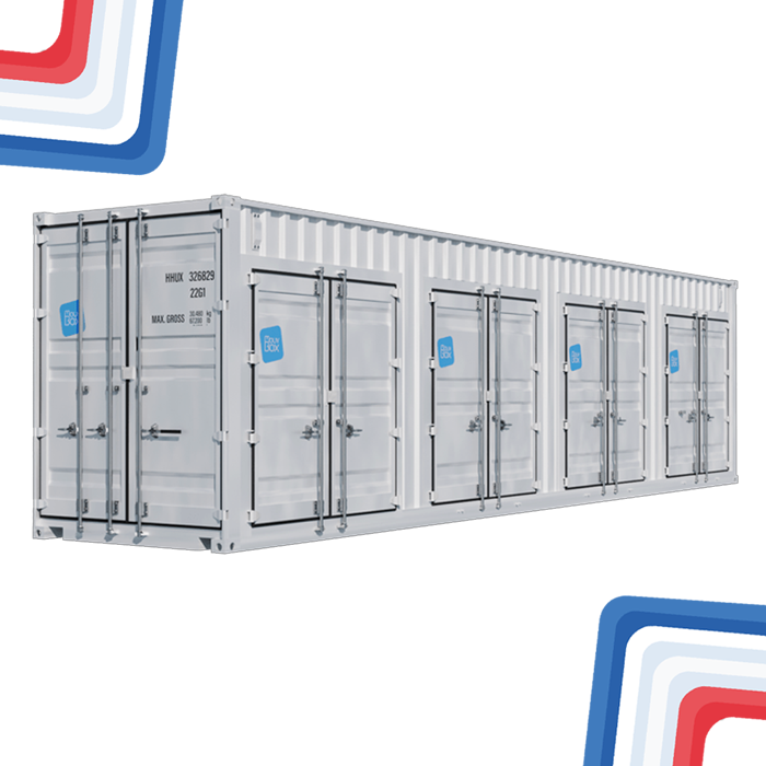 Le Container “4-Box”, issu d’un container 40 pieds High Cube avec +30 cm en hauteur, offre quatre espaces de 17m³, sécurisés par cinq portes doubles, parfait pour divers besoins de stockage dans les centres de self-stockage, garages automobiles, déchetteries ou entreprises.